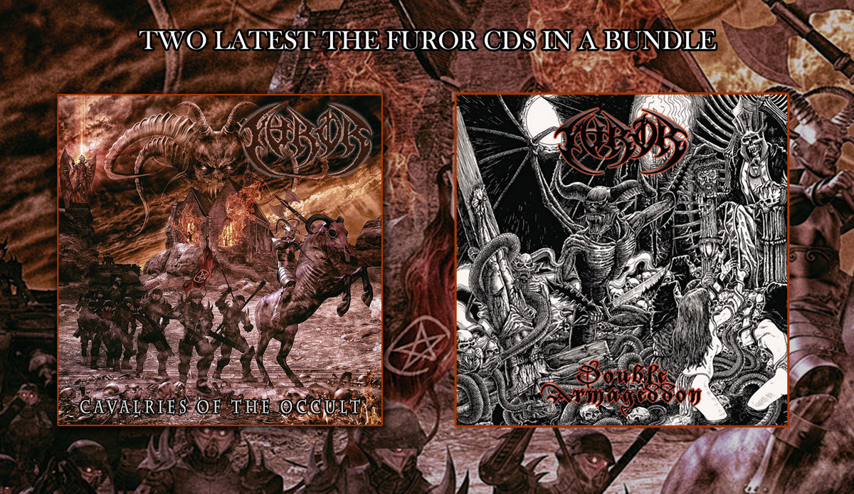 Two very hard to find EPs of THE FUROR are now pressed on a single CD this year and it's probably their most devastating material yet! Here's a bundle deal where you get CDs of 'Cavalries of the Occult' full length and the new release in context 'Double Armageddon' together at a discounted price. You can check out a couple of tunes here off the new one -